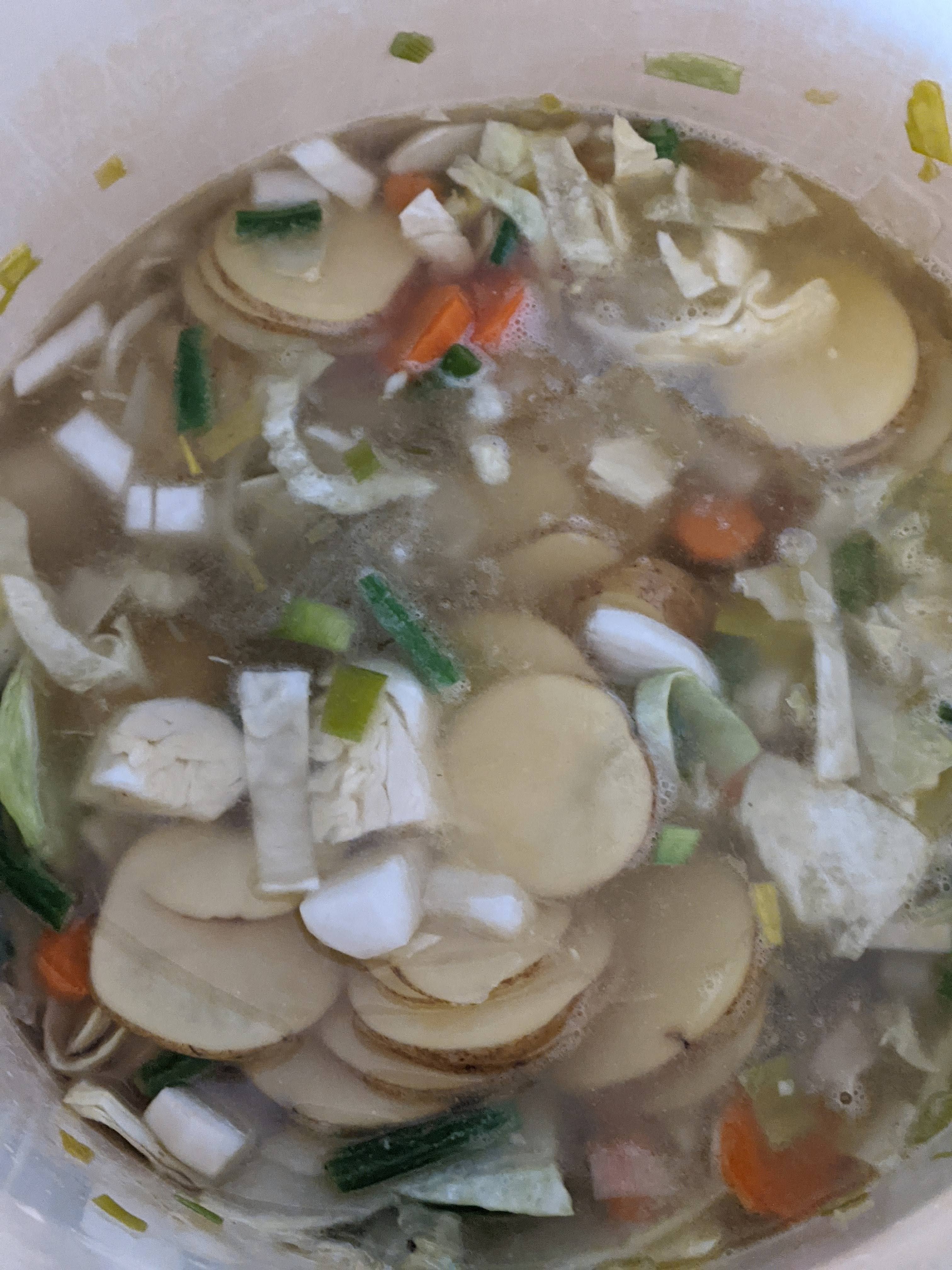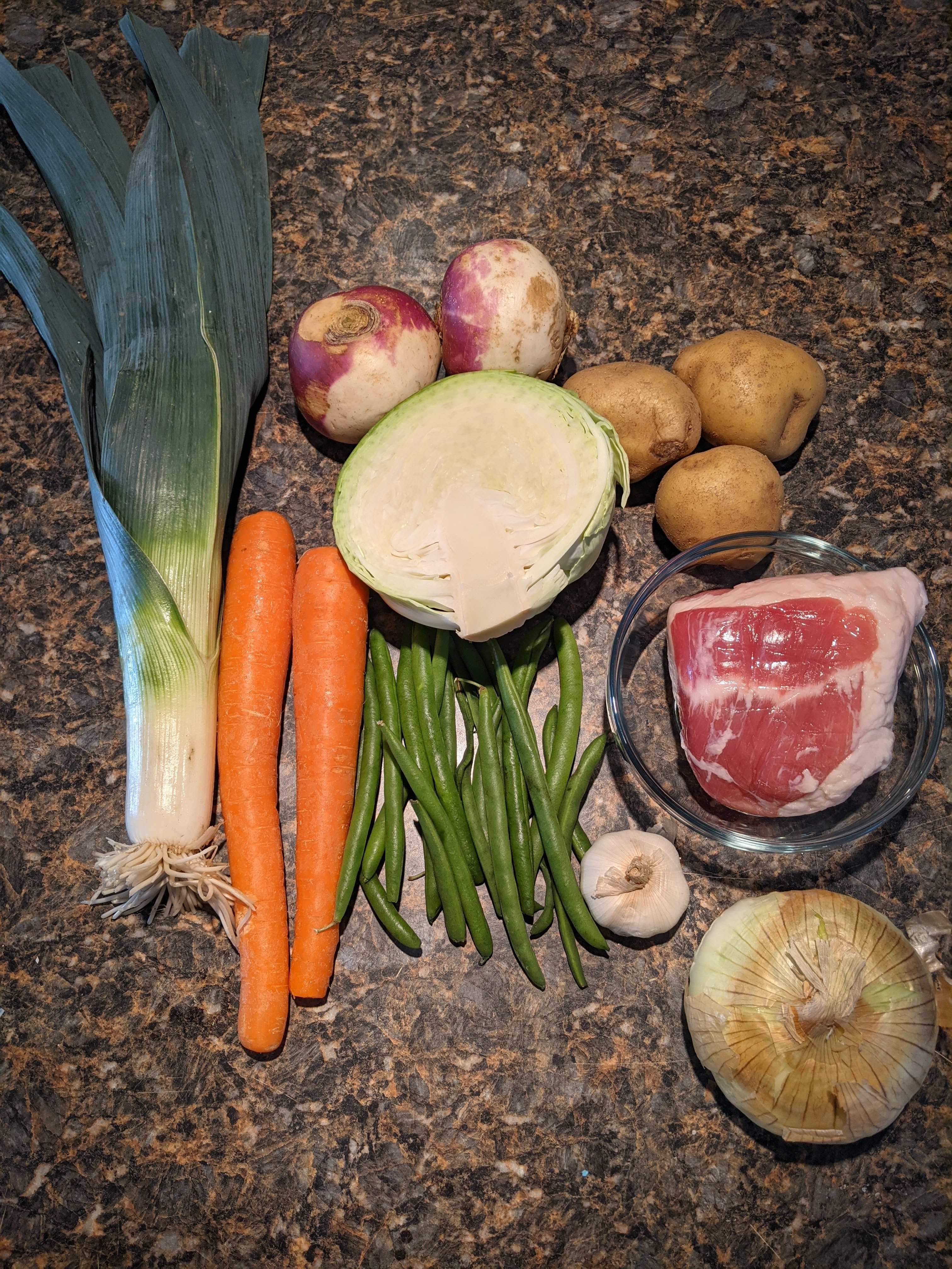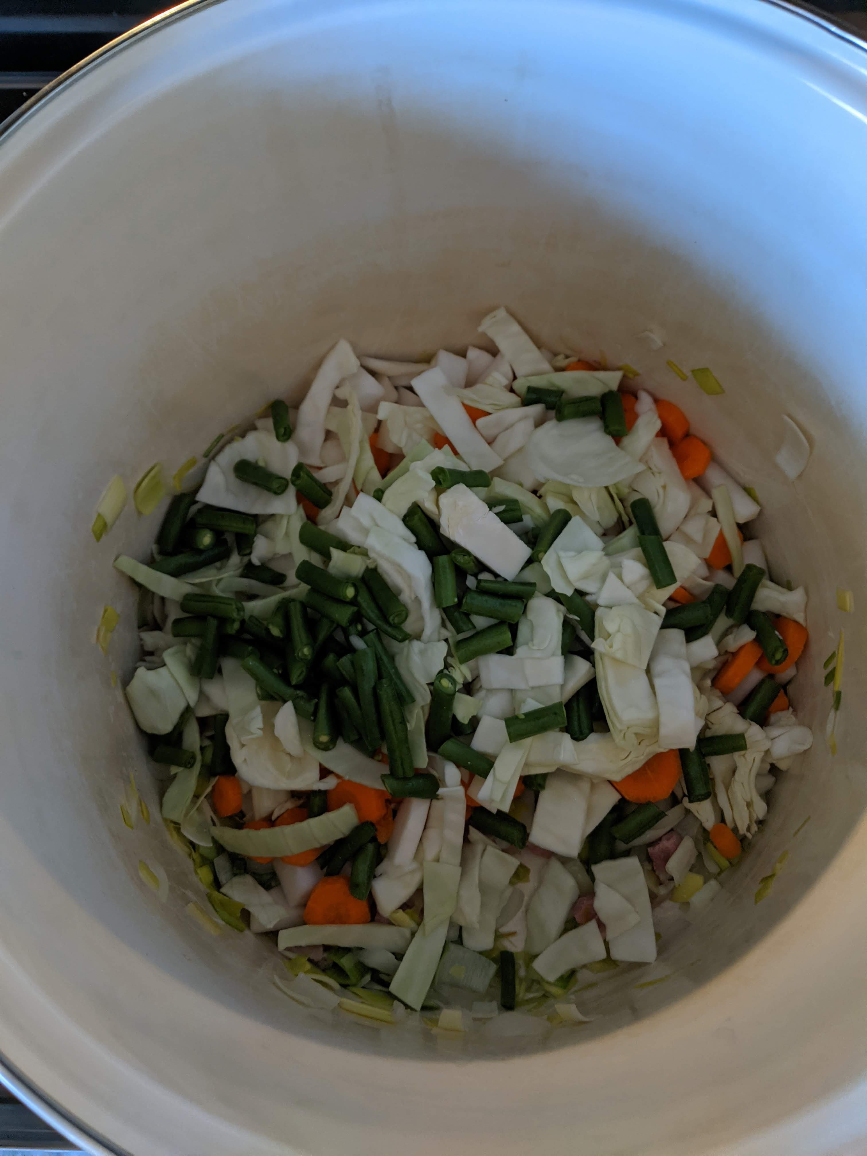While the fat was rendering, I prepped all my other ingredients. In French cooking, laying out and organizing your ingredients is called mise en place and it is, as they say, a game-changer. The second most important tip I have for prepping these ingredients is always wash leeks thoroughly! They get lots of dirt between the layers. Once everything was prepped, I browned the meat and started adding the first round of vegetables, water, and then a second round of vegetables. I’m assuming the recipe was written this way to keep some of the vegetables like the potatoes from getting too mushy from cooking for too long. The soup ended up delicious both the day of cooking and the next day. Like most of Great Depression recipes I’ve prepared, it would probably benefit from fresh herbs and more aggressive seasoning.