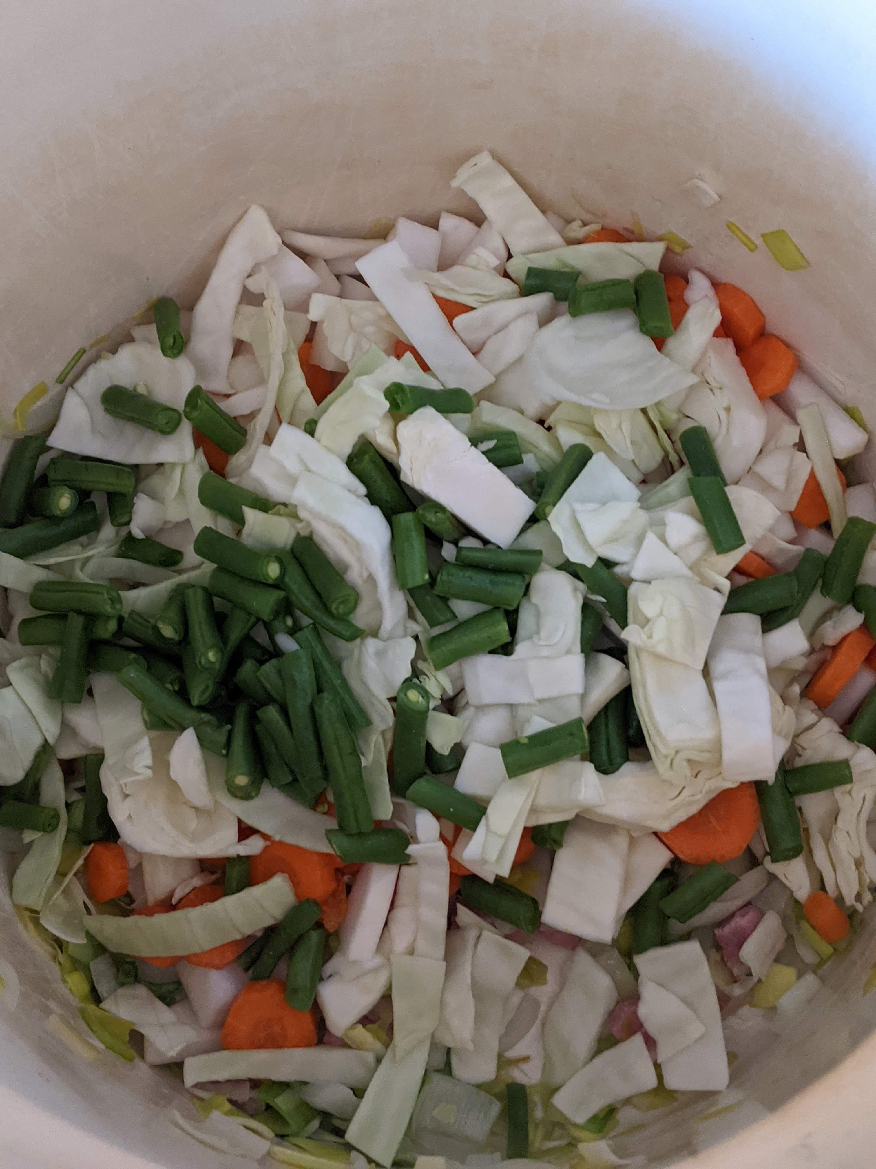 - Add carrots, turnips, cabbage, and beans; stir occasionally (about another 15 minutes)